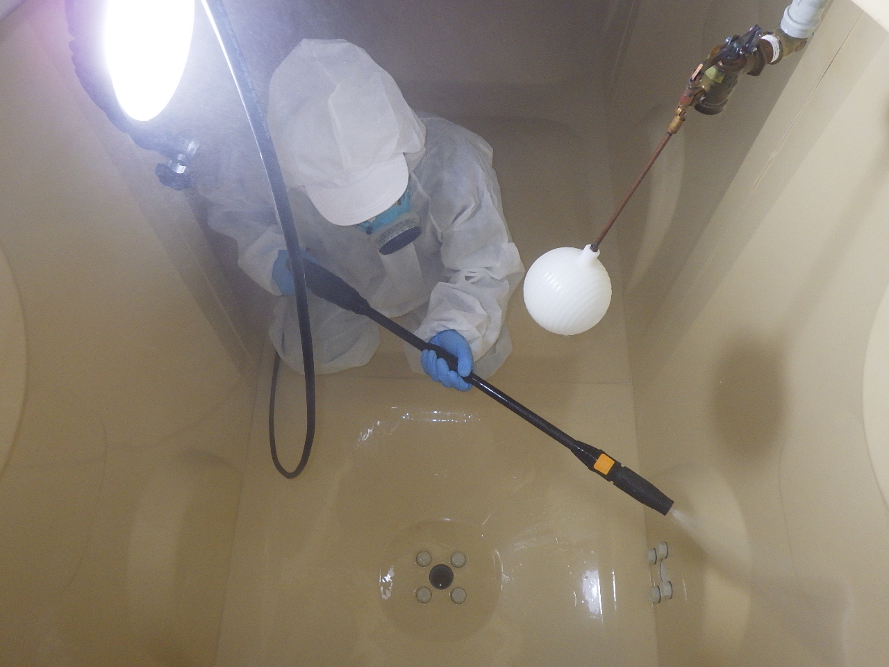 そのあとタンク内を高圧洗浄機で洗浄・塩素消毒を2回繰り返し給水して完了です。