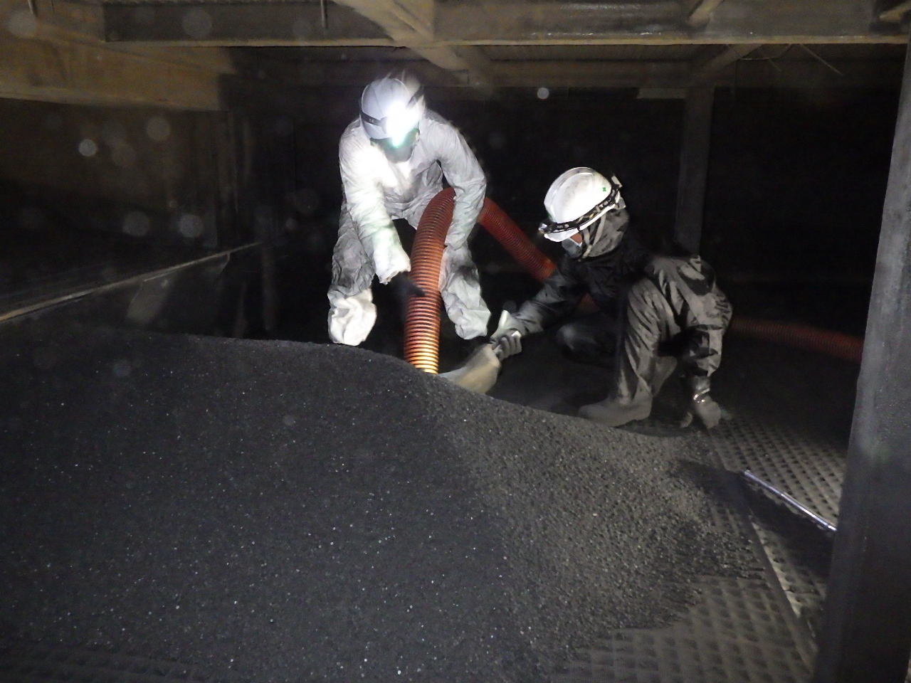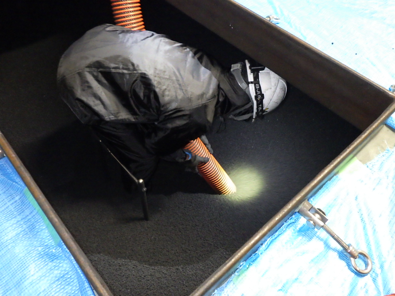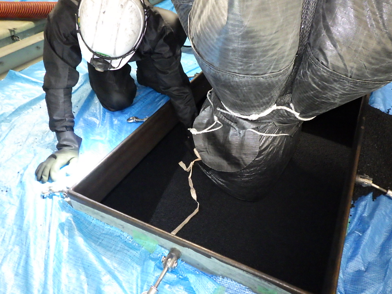 吸着塔内を清掃して、新しい活性炭を充填して作業終了です。