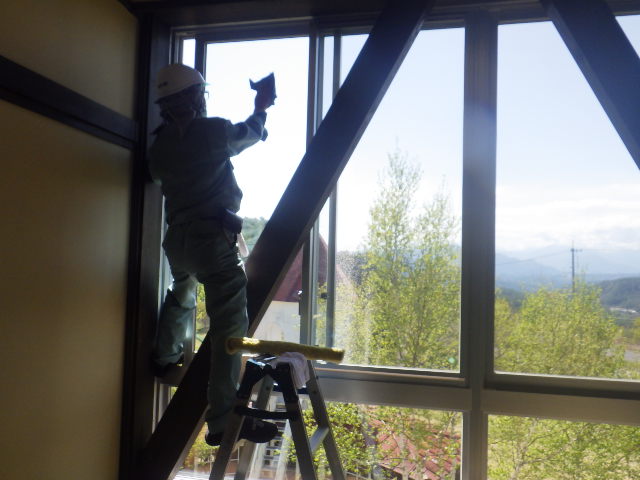 施設内の窓清掃は高所で行う作業で、脚立に上り行う為足場が悪く危険な作業となります。