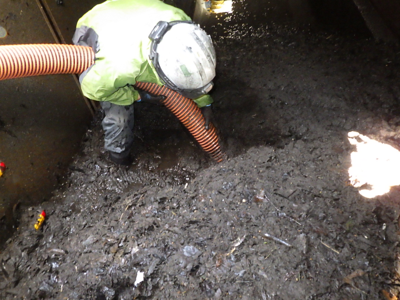 現場の状況にもよりますが、堆積している土砂は長年で固着している為、洗浄ガンで崩しながら吸引していきます。